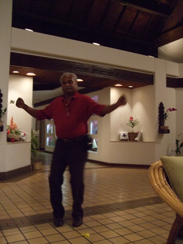 。部屋はフツウのホテルと違い、棟ごとに分かれていて、ジャングルの中にあるような廊下を通って部屋へ。運良くロビーからとても近い棟だった。しかし着いたのは22:00、真っ暗、海は波音しか聞こえず・・・。部屋は広く近代的。テレビなんか、うちにあるやつよりええやんか。
