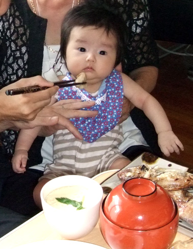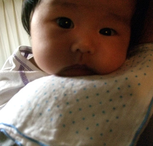 助産院に着いたら、床に小さな布団が横一列にズラーッと並べられていた。そこのひとつにウーを寝かせ受付をしていると、ウーが泣き出した。まぁ、しょうがないと思って放置して受付を済ませ、ウーのところへ戻ると、なんと隣に寝かされた男子(7ヶ月)と手をつないでいた(笑)。その男子のママが「あんた!女の子みたらすぐナンパして!!」って言っていた(笑)。