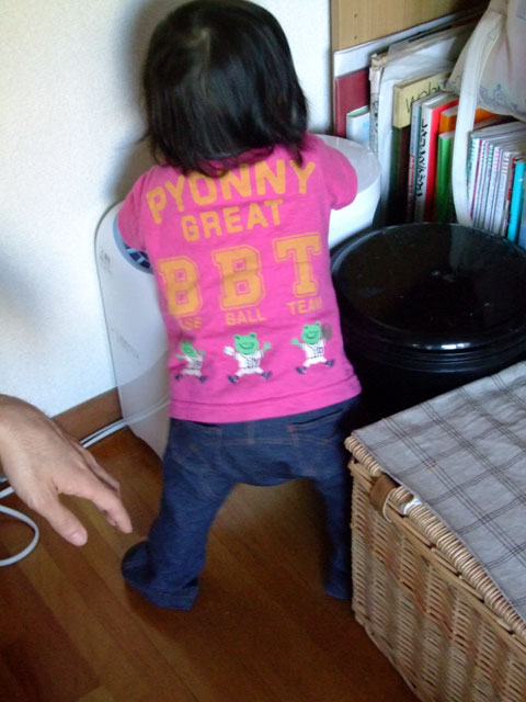 と煽られている。足は膝カクカク、そのせいでお尻フリフリ・・その姿は何か笑える。そのままゴミ箱〜収納カゴへと微妙な伝い歩きをした。そ・・そんな一気にまとめて??